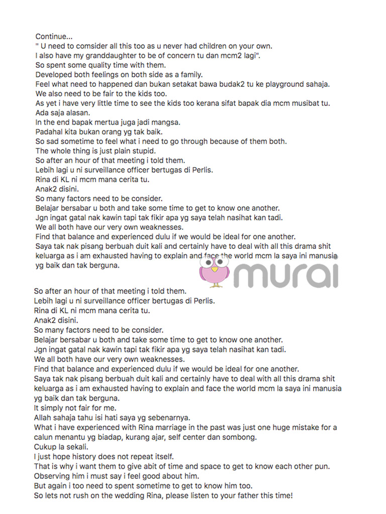 “Jadi belajar bersabar kamu berdua dan ambil masa. Jangan ingat gatal nak kawin tapi tak fikir apa yang saya telah nasihat kan tadi. Kita semua ada kekurangan” tulisnya lagi