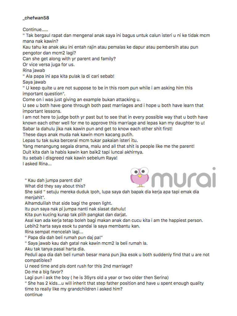 Menerusi pendedahan panjang sebanyak 3 hantaran di laman Instagram, Chef Wan memaklumkan bahawa dia sudah bertemu dengan bakal menantu nya itu yang merupakan seorang pegawai polis selepas Serina ingin melangsungkan perkahwinan mereka sebelum hari raya.