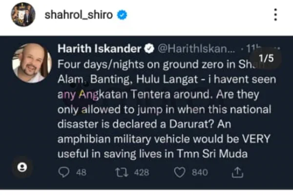 Kecoh di media sosial mengenai isu Angkatan Tentera Malaysia (ATM) tidak turun padang bantu mangsa banjir mendapat perhatian ramai, apatah lagi pelakon dan pelawak terkenal Harith Iskander juga turut menyoal isu yang serupa di laman Twitternya.