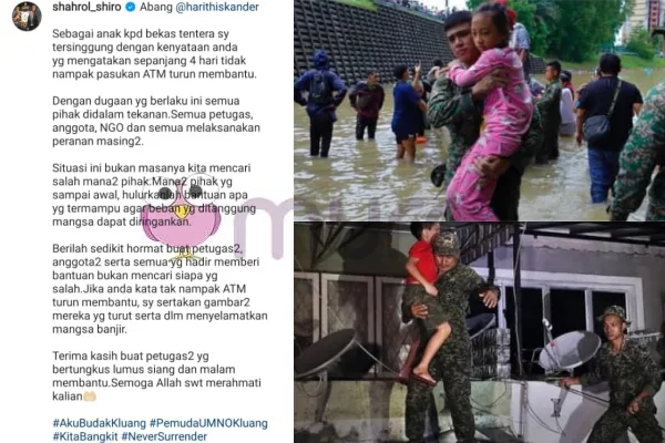 Dalam masa yang sama Shahrol juga menegur bahawa setiap petugas yang hadir memberi bantuan harus dihormati, pelawak ini juga berkongsi beberapa foto anggota tentera menyelamatkan mangsa banjir di Instagramnya sebagai bukti Angkatan Tentera Malaysia menjalankan tugas.