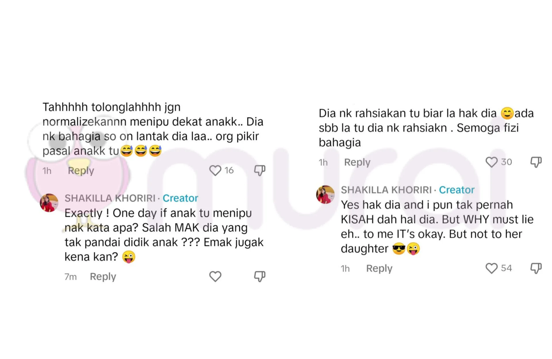 Dalam pada itu, pelakon drama Suri Hati ini turut menjawab komen netizen dan mempersoalkan tindakan Fizi yang sanggup menipu anak mereka, Ameena Sofia.