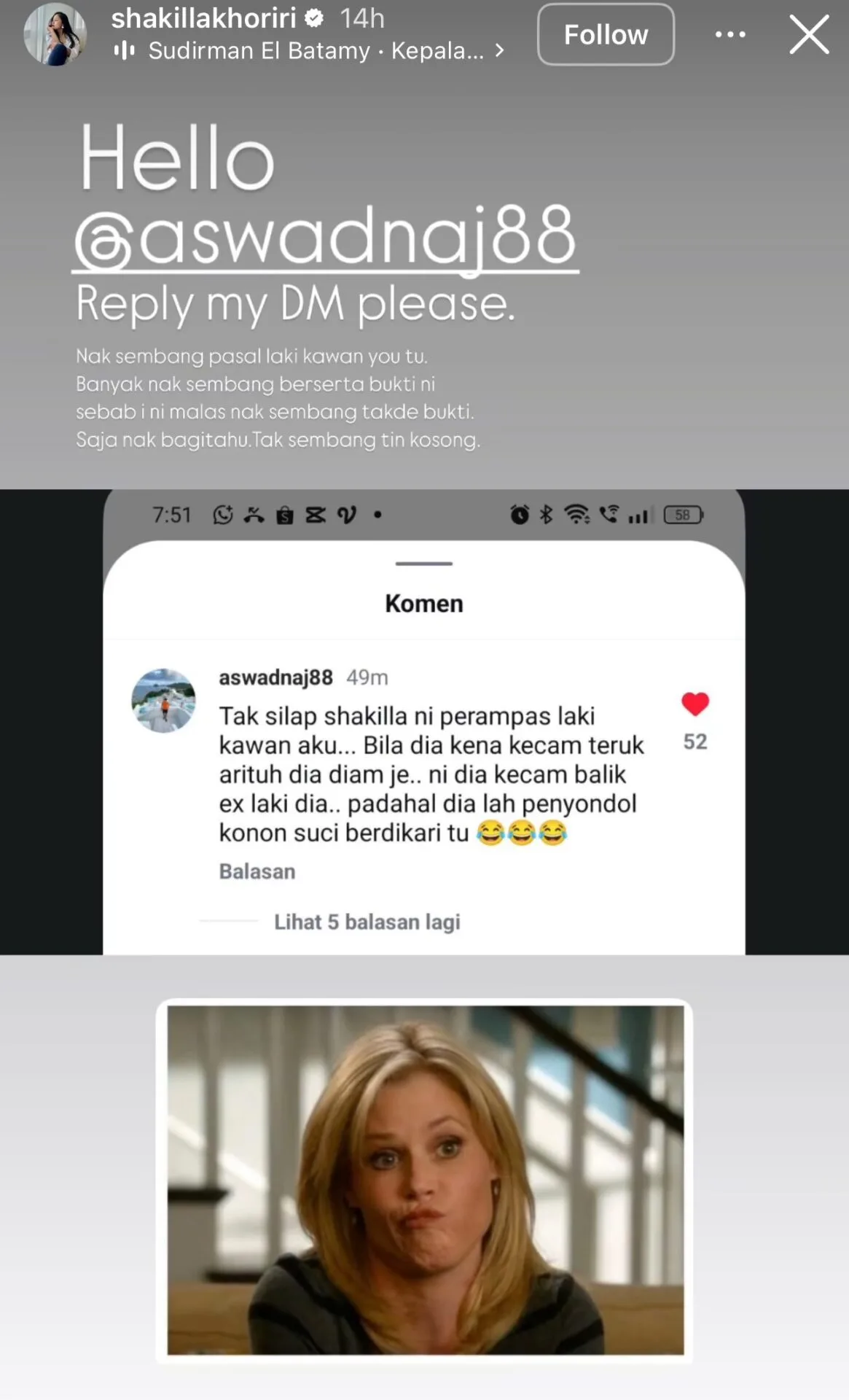 Tidak berdiam diri, Shakilla menerusi hantaran di Insta Stories yang turut memuatnaik tangkap layar komen berkenaan turut mengajak netizen terlibat untuk bersemuka disebabkan tuduhan tersebut.
