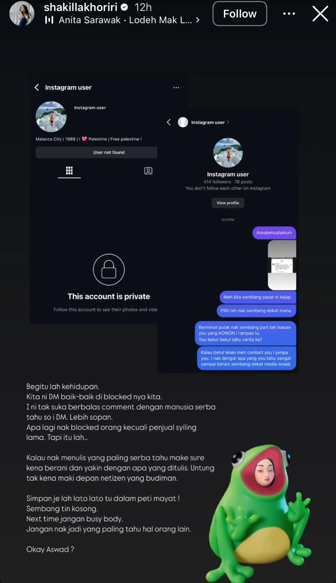 Dalam pada itu, Shakilla turut meluahkan rasa kesal terhadap netizen terlibat yang telah menyekatnya di Instagram selepas pelakon ini menghantar DM (Direct Message) secara baik.