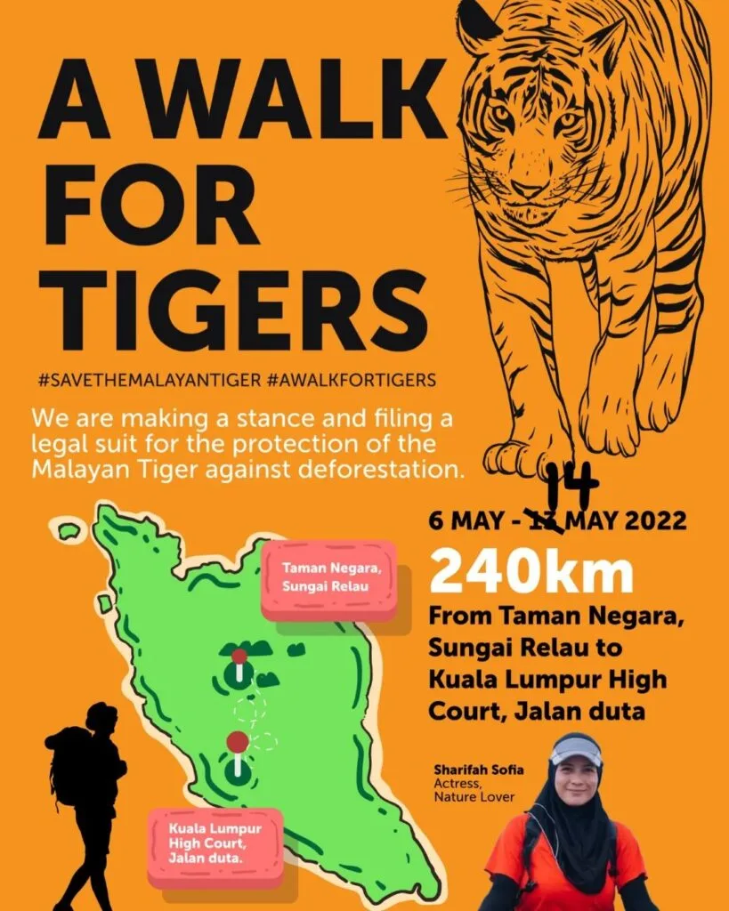 Menurut poster yang dikongsi aktres itu di akaun Facebooknya, trek yang dipanggil ‘A Walk For Tigers’ itu bermula pada 6 Mei dan berakhir pada 14 Mei. Ia dianjurkan untuk menggesa agensi kerajaan supaya mengakui keadaan kritikal populasi harimau Malaya dan seterusnya melindungi haiwan ini.