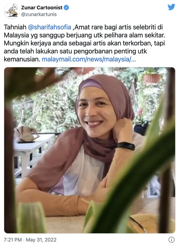 “Amat jarang melihat artis selebriti di Malaysia yang sanggup memperjuangkan alam sekitar. Walaupun dia mungkin baru sahaja mengorbankan kerjayanya sebagai seorang artis, tetapi dia membuat pengorbanan penting untuk manusia.”