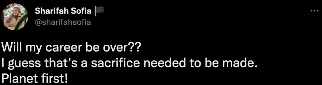 Adakah kerjaya saya akan berakhir?? Saya rasa itu pengorbanan yang perlu dilakukan. Planet dahulu!- tulisnya di twitter