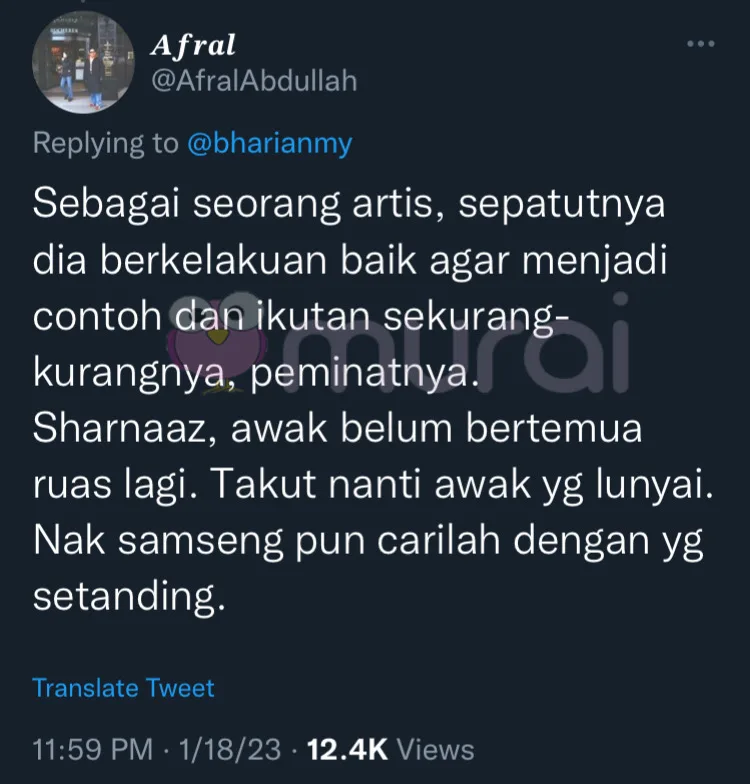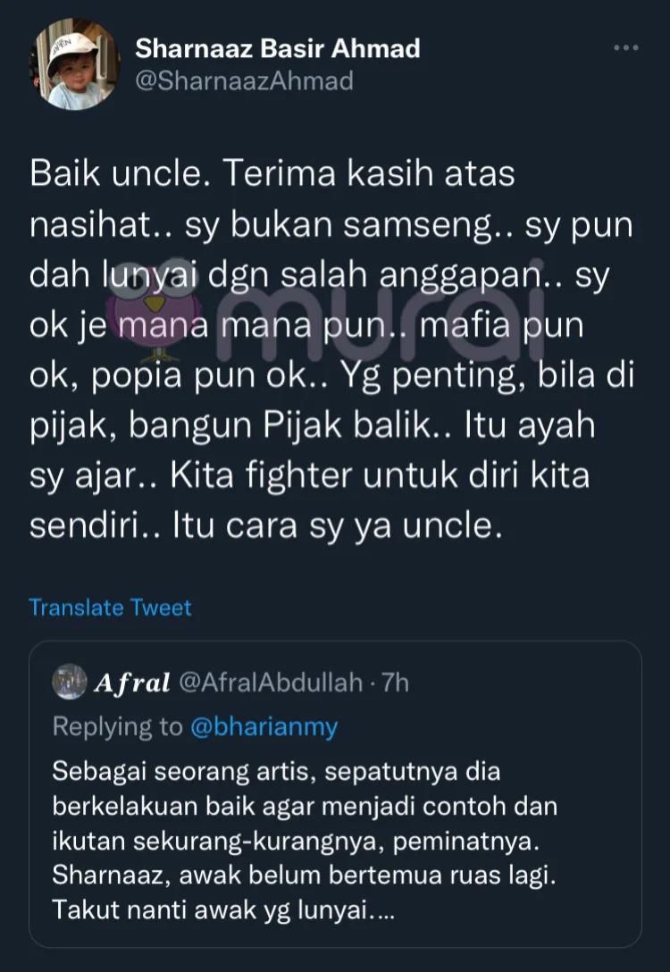 Pelakon ini dilihat telah quote retweet ciapan netizen tersebut dengan menitipkan ucapan terima kasih di atas nasihat yang diberikan olehnya. Jelas Sharnaaz, dia bukanlah seorang samseng dan telahpun ‘lunyai’ dengan tanggapan yang salah oleh pihak terlibat.