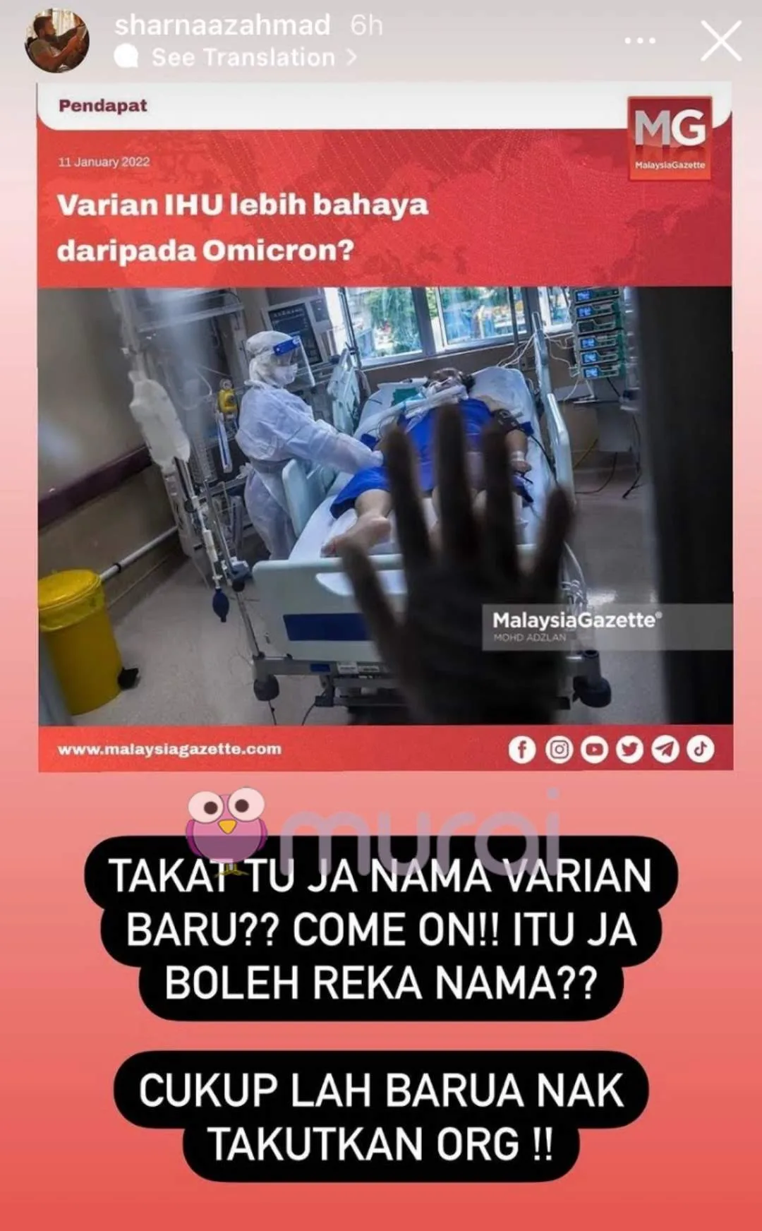 Pelakon, Sharnaaz Ahmad meluahkan rasa kecewa apabila mengetahui terdapat varian baru COVID-19, Varian IHU yang dikesan di Perancis yang dikatakan lebih mudah merebak dan lebih mampu menentang vaksin.