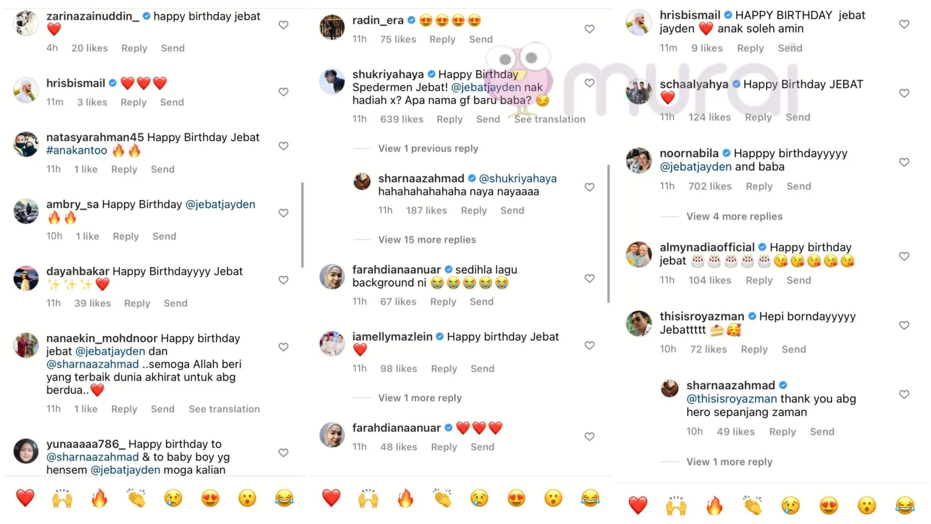 Dalam pada itu, rata-rata rakan selebriti seperti Scha Alyahya, Almy Nadia, Radin Era, Elly Mazlein dan ramai lagi dilihat membanjiri komen hantaran Sharnaaz dan turut menitipkan ucapan ulang tahun buat Sharnaaz dan Jebat Jayden.