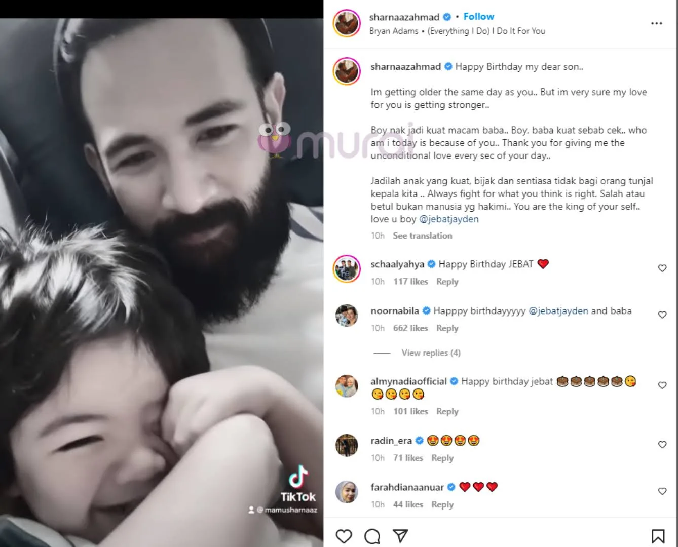 Menerusi hantaran di Instagram, Sharnaaz dilihat turut menitipkan ucapan istimewa buat anak lelakinya yang kini sudah berusia empat tahun.