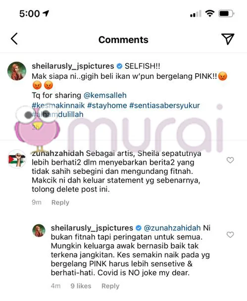 “Sebagai artis, Sheila sepatutnya lebih berhati-hati dalam menyebarkan berita-berita yang tidak sahih sebegini dan mengundang fitnah. Makcik ini dah keluar kenyataan yang sebenarnya. Tolong hapuskan hantaran ini”- tulis salah seorang netizen.