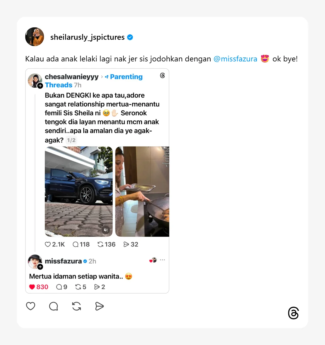 Sheila menerusi hantaran di Thread dilihat memuatnaik tangkap layar komen Fazura di Thread yang menyifatkan dia sebagai mentua idaman setiap wanita selepas melihat hubungan Sheila yang akrab bersama kedua-dua menantunya iaitu Elisya Sandha dan Beatrice Chitra.