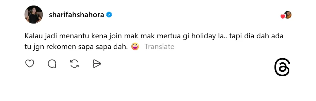 “Kalau jadi menantu kena join mak-mak mentua gi holiday la. Tapi dia dah ada tu, jangan recommend siapa-siapa dah.”-Sharifah Shahora