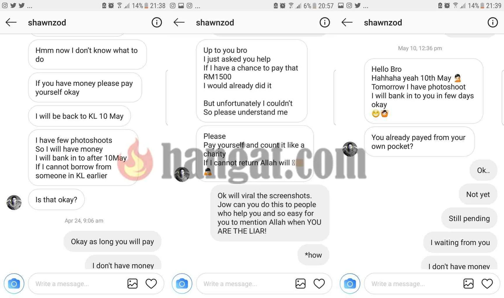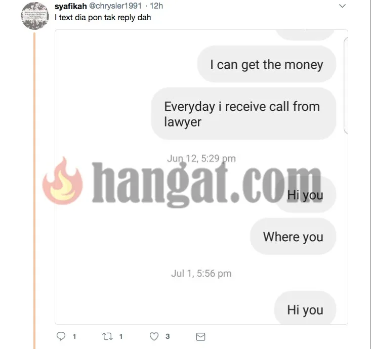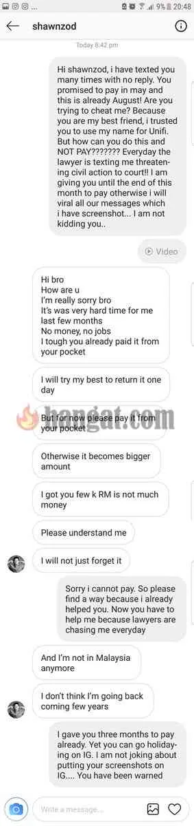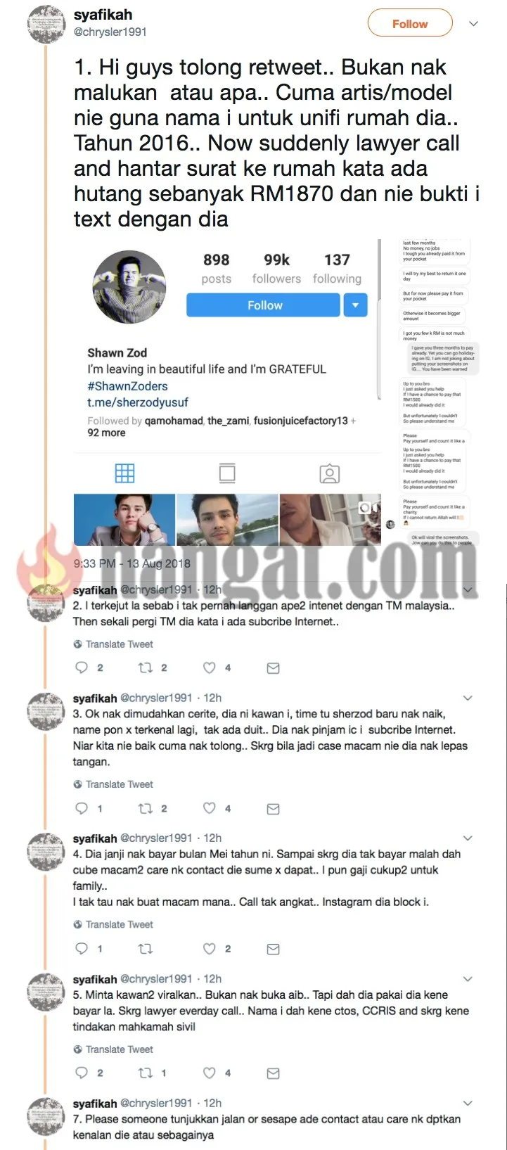 Menerusi Twitter nya, netizen tersebut mendakwa Sherzod yang juga sahabatnya telah mempergunakan namanya untuk kemudahan internet dan terkejut apabila peguam telah menghantar sepucuk surat yang mengatakan bahawa dia tidak melunaskan bayaran kemudahan tersebut yang berjumlah RM1870.
