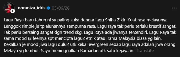 “Saya sedih apabila Noraniza Idris terima kecaman seperti itu. Pada saya, macam ini ke jadi peminat? Kenapa sanggup komen seperti itu? Saya sangat neutral. Saya rasa dia tidak buat salah. Dia tidak komen terlalu kasar yang ditujukan atau libatkan orang lain.”
