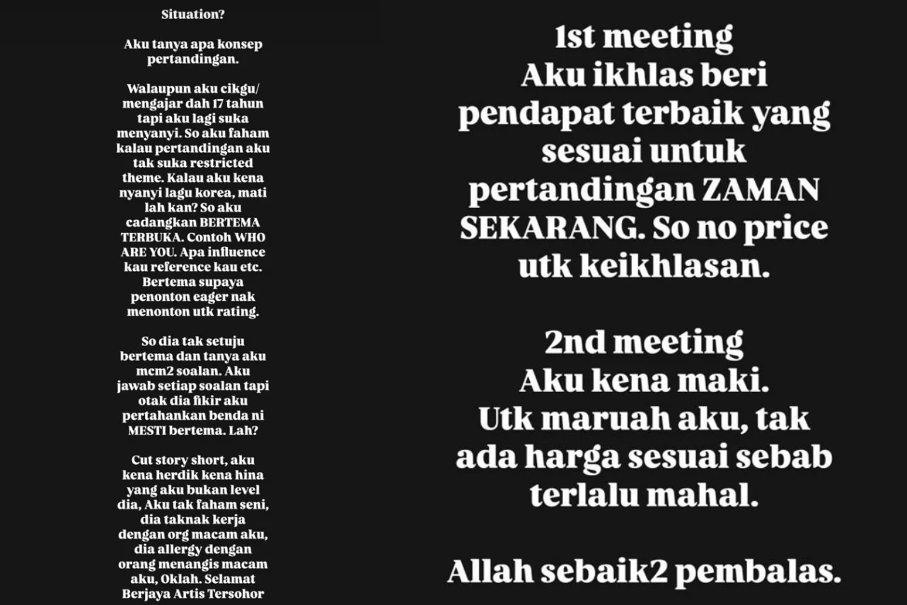 “Cut story short, aku kena herdik kena hina yang aku level dia. Aku tak faham seni, dia tak nak kerja dengan orang macam aku, dia allergy dengan orang menangis macam aku. Oklah. Selamat berjaya artis tersohor.”