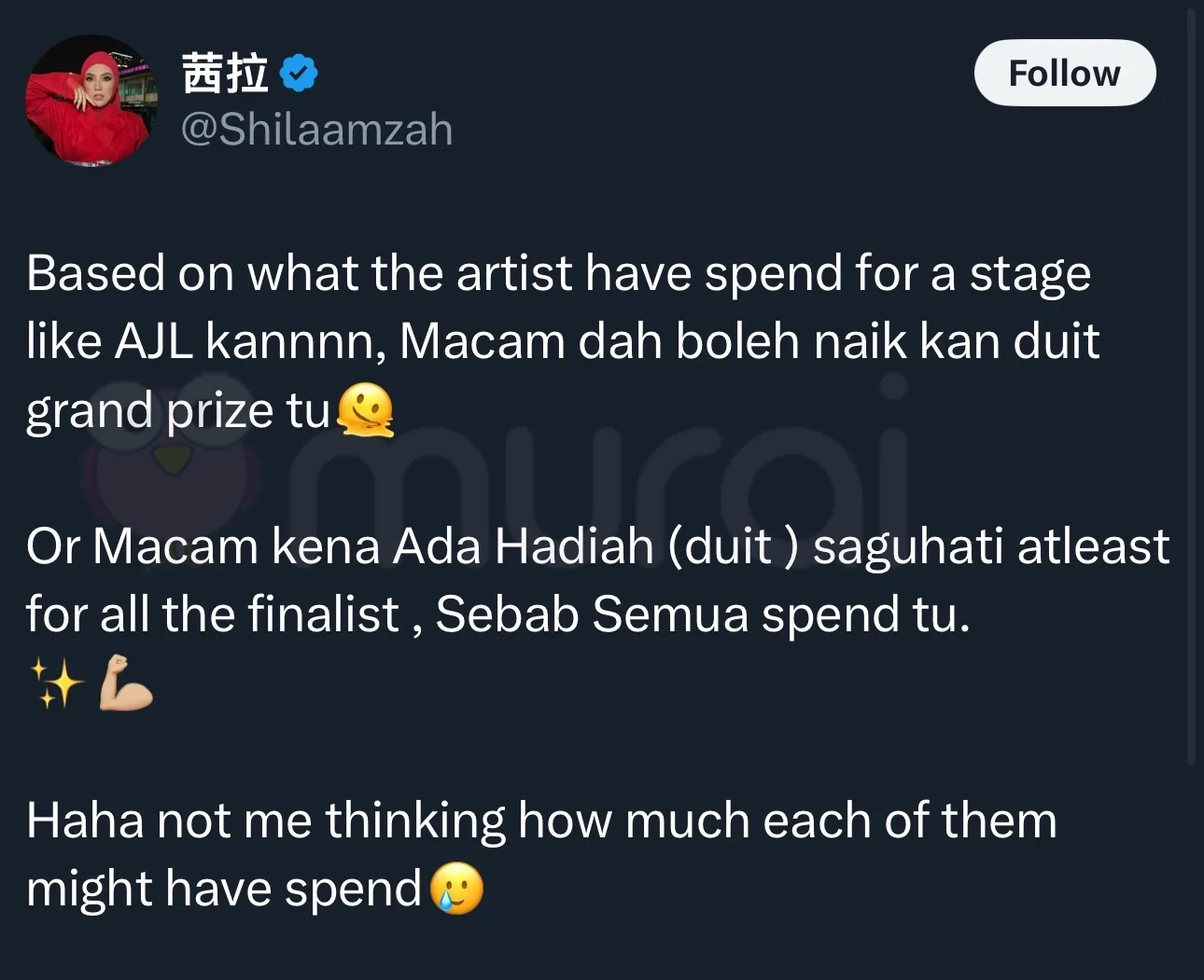 “Kalau hadiah masih sama, artis harus buat persembahan sesuai bajet hadiah AJL bagi. Takde rasa terbuang kan. Sedih tengok nilai hadiah AJL takde naik-naik. Hahaha 2025 kot.”