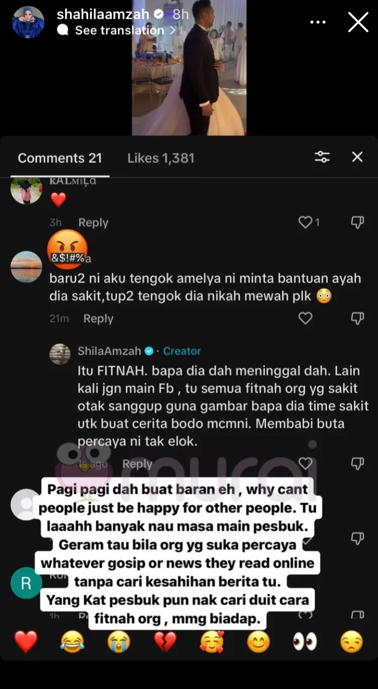 Shila Amzah menerusi hantaran di Insta Stories, dilihat memuatnaik tangkap layar komen netizen yang mempersoalkan penyanyi lagu Bukan Cinta ini didakwa pernah meminta bantuan orang ramai untuk merawat bapanya yang sedang sakit sebelum mengadakan majlis resepsi yang mewah.