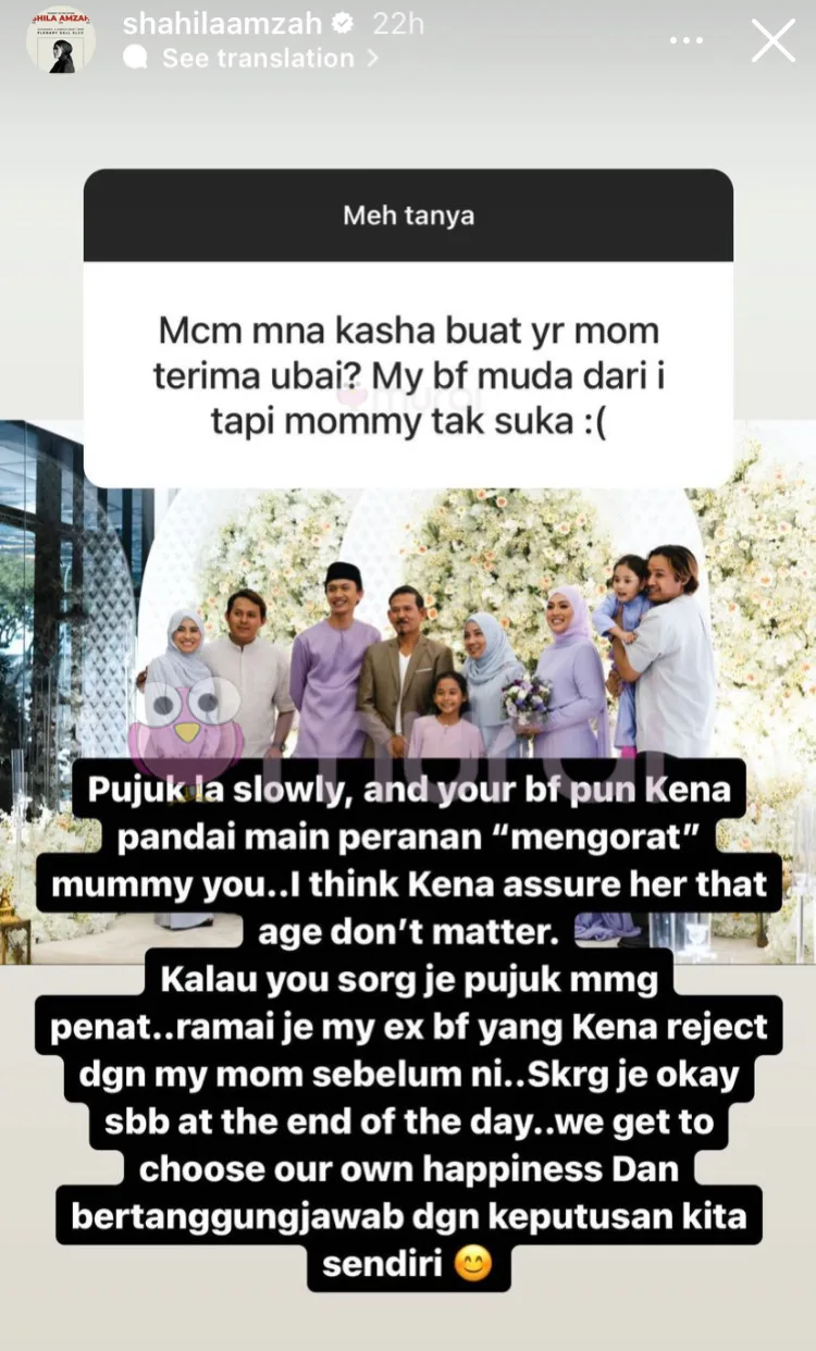 “Pujuk la slowly, dan teman lelaki anda pun kena pandai main peranan ‘mengorat’ mummy you. Saya rasa kena yakinkan dia bahawa usia bukanlah segalanya. Kalau you sorang je pujuk memang penat..”-Jawab Shila