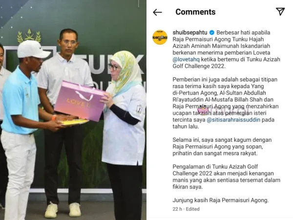 “Berbesar hati apabila Raja Permaisuri Agong Tunku Hajah Azizah Aminah Maimunah Iskandariah berkenan menerima pemberian Loveta @lovetahq ketika bertemu di Tunku Azizah Golf Challenge 2022.