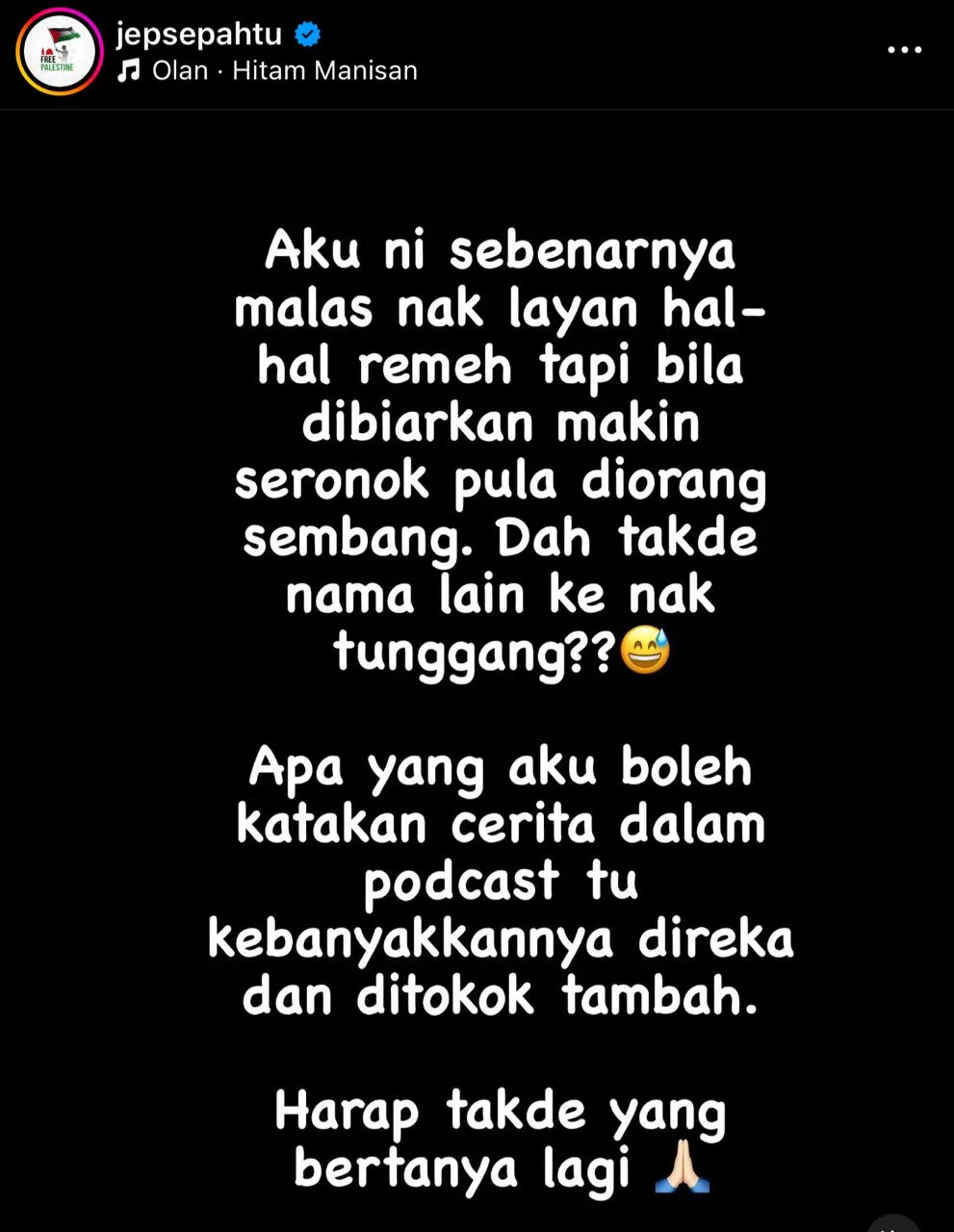 Dalam satu hantaran di Instagram, Jep menegaskan bahawa apa yang diceritakan dalam podcast itu kebanyakannya adalah rekaan dan ditokok tambah.