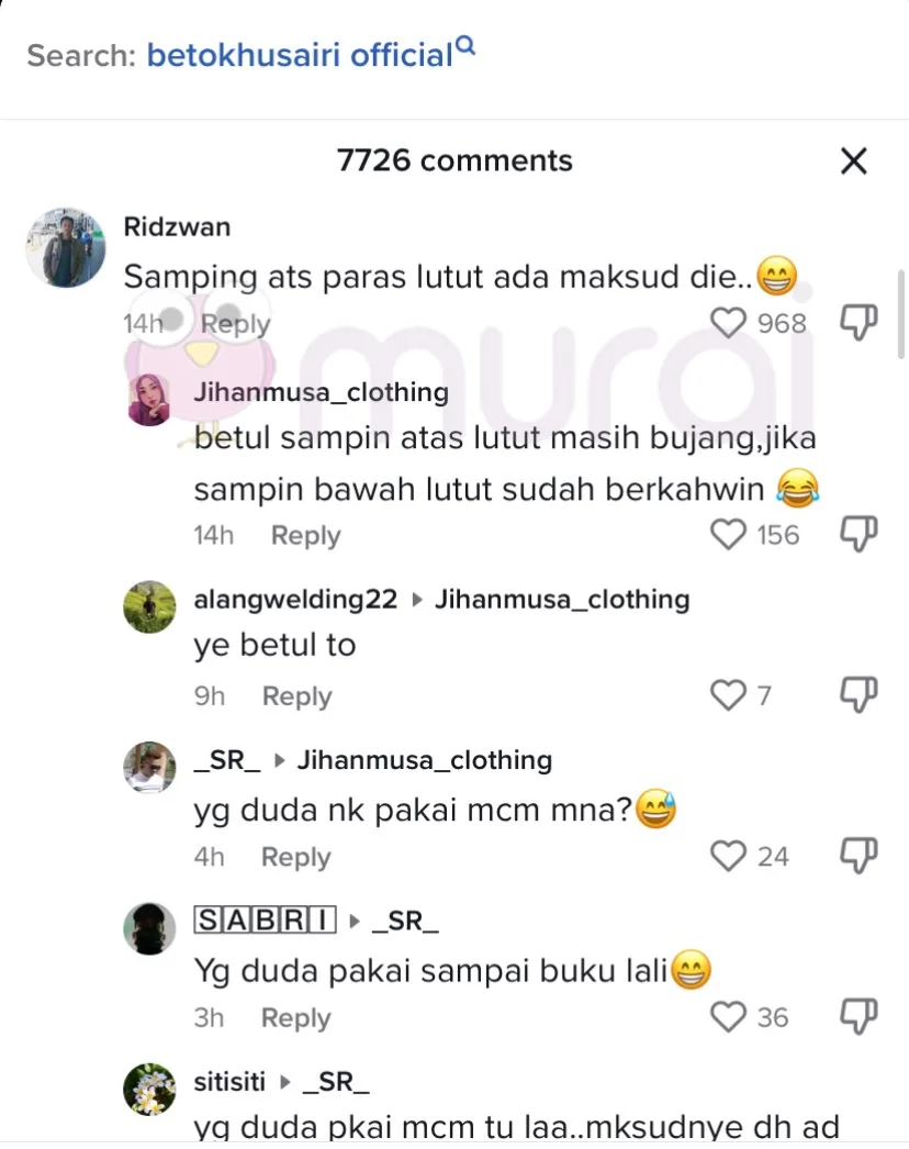 “Orang kata kalau sampin lebih dari lutut maksudnya bujang, kalau atas lutut dah kawin, tapi kalau sampin paras peha ni taktau apa maksud”-tanya mereka