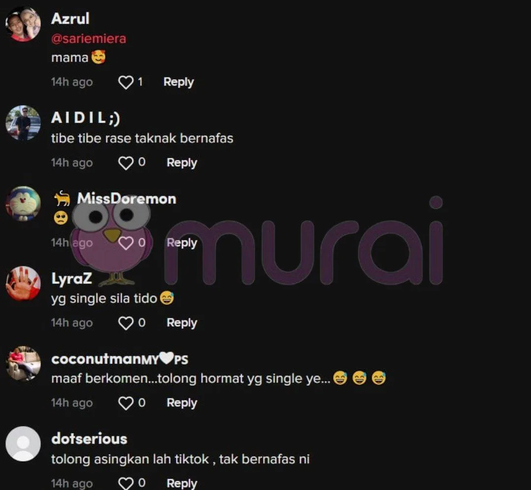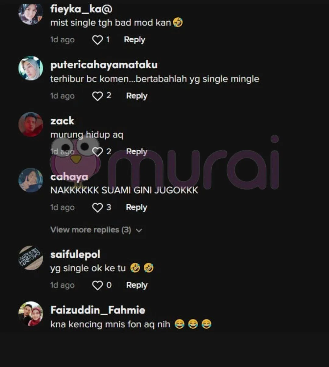 Murai MY tertarik dengan komen yang mengatakan mereka menyesal membuka aplikasi tiktok pada ketika itu kerana video tersebut merupakan video yang pertama lalu di tiktok. Ada netizen yang menyindir orang yang single pasti badmood selepas melihat video itu.