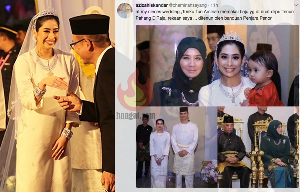 Rata-rata netizen menganggap baju perkahwinan Tunku Inah mesti ditempah dan diperbuat khas oleh pereka fesyen terkenal. Namun tahukah anda, baju perkahwinan Tunku Aminah ini sebenarnya direka khas oleh ibu saudaranya sendiri yang juga Tengku Puan Pahang, Tunku Hajjah Azizah Aminah Maimunah Iskandariah binti Almarhum Almutawakkil Alallah Sultan Iskandar Al-Haj.
