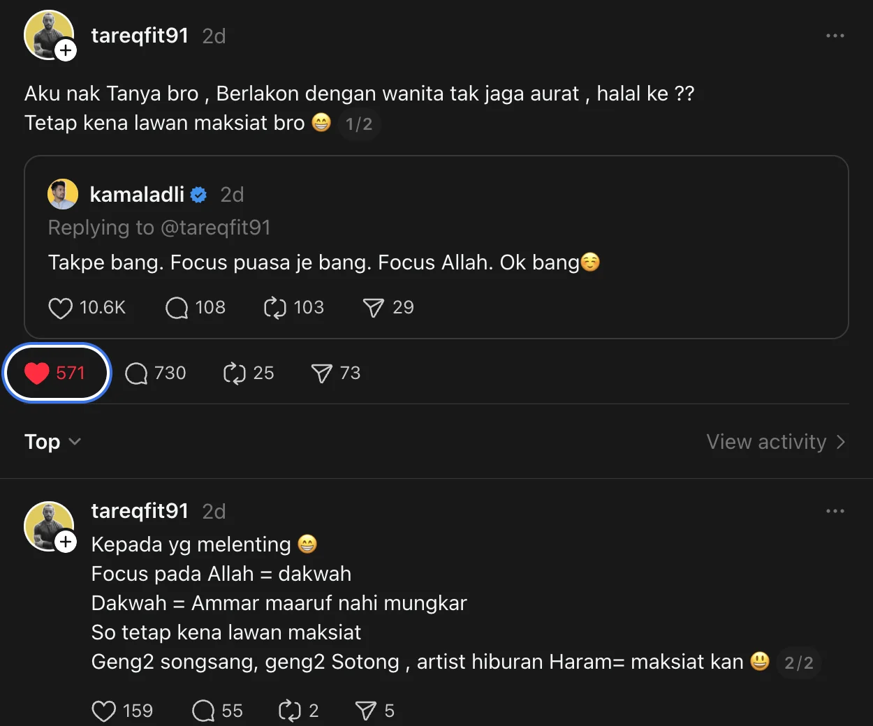 Kalau diperhati, setiap kali Tareq Fit bersuara, topik yang dibawa memang dekat dengan isu sensitif dan pandangan peribadi orang lain. Dia bukan selebriti, tapi cara dia memilih isu membuatkan namanya sentiasa timbul dalam perbualan online.