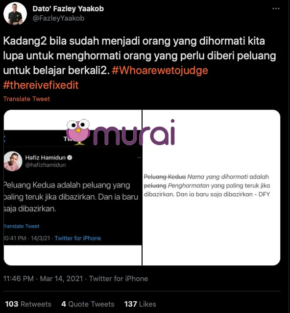 “Kadang-kadang bila sudah menjadi orang yang dihormati kita lupa untuk menghormati orang yang perlu diberi peluang untuk belajar berkali-kali. #Whoarewetojudge #thereivefixedit” tulis Fazley
