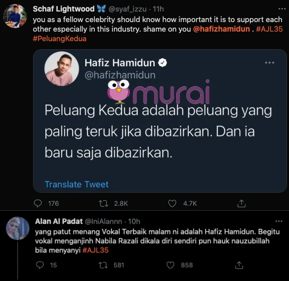 Penyanyi dan komposer Hafiz Hamidun teruk dikecam oleh netizen selepas memuat naik ciapan ciapan mengenai Nabila Razali yang menyanyikan lagu Peluang Kedua, di pentas Anugerah Juara Lagu (AJL) 35 malam tadi.