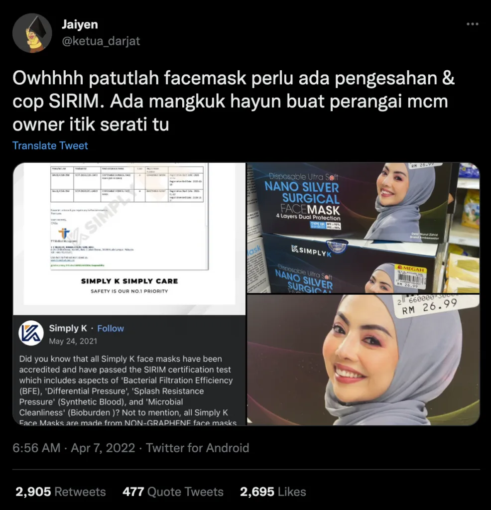 Salah seorang pengguna di Twitter berkongsi tangkap layar maklumat kos pensijilan yang dikenakan ke atas syarikat dan individu yang menjual pelitup muka bukan perubatan bagi mendapatkan penandaan Sirim dan menulis ciapan dengan mempersoalkan kos tinggi yang dikenakan.