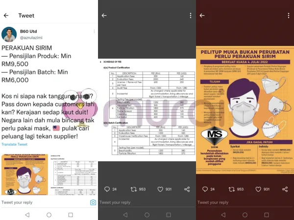 “Perakuan Sirim – Pensijilan Produk: Min RM9,500 -Pensijilan Batch: Min RM6,000 Kos ni siapa nak tanggung nanti? Turunkan kepada pelanggan lah kan? Kerajaan sedap kaut duit! Negara lain dah mula bincang tak perlu pakai pelitup muka, Malaysia pula cari peluang lagi tekan pembekal!” ciap netizen