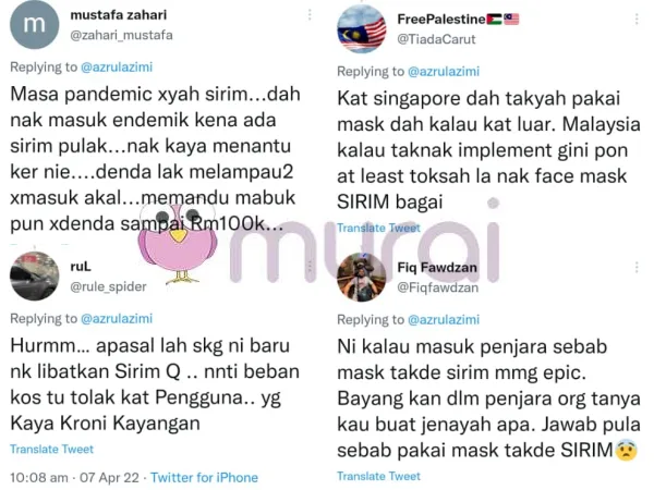 “Kat Singapura dah tak payah pakai pelitup muka dah kalau kat luar. Malaysia kalau taknak implement gini pun sekurang-kurangnya toksah lah nak pelitup muka SIRIM bagai” ciap mereka