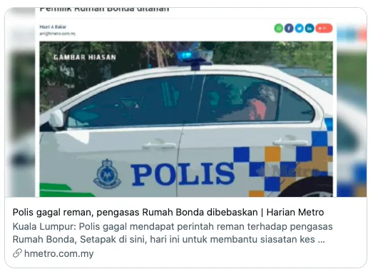 “So, ‘gagal’ yang dimaksudkan ialah tiada sebab untuk pihak polis menahan saspek dalam lokap tetapi siasatan boleh diteruskan seperti biasa. Tak bermaksud suspek terlepas tak tentu pasal. Kalau siasatan menunjukkan ada kes terhadap beliau, boleh dituduh pada bila-bila masa.”- ujarnya.