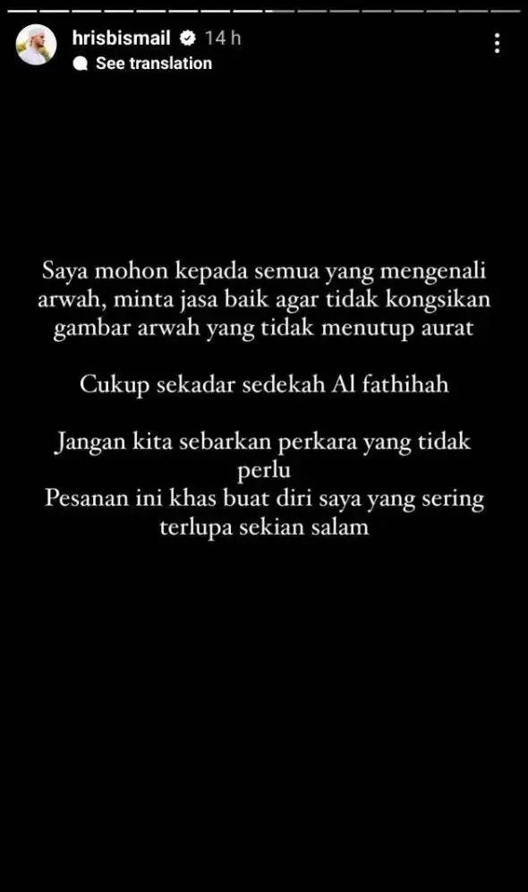 Menerusi Insta Stories, PU Riz berpesanan agar cukuplah hanya dengan sedekahkan Al-Fatihah dan tidak berkongsi foto arwah yang tidak menutup aurat.