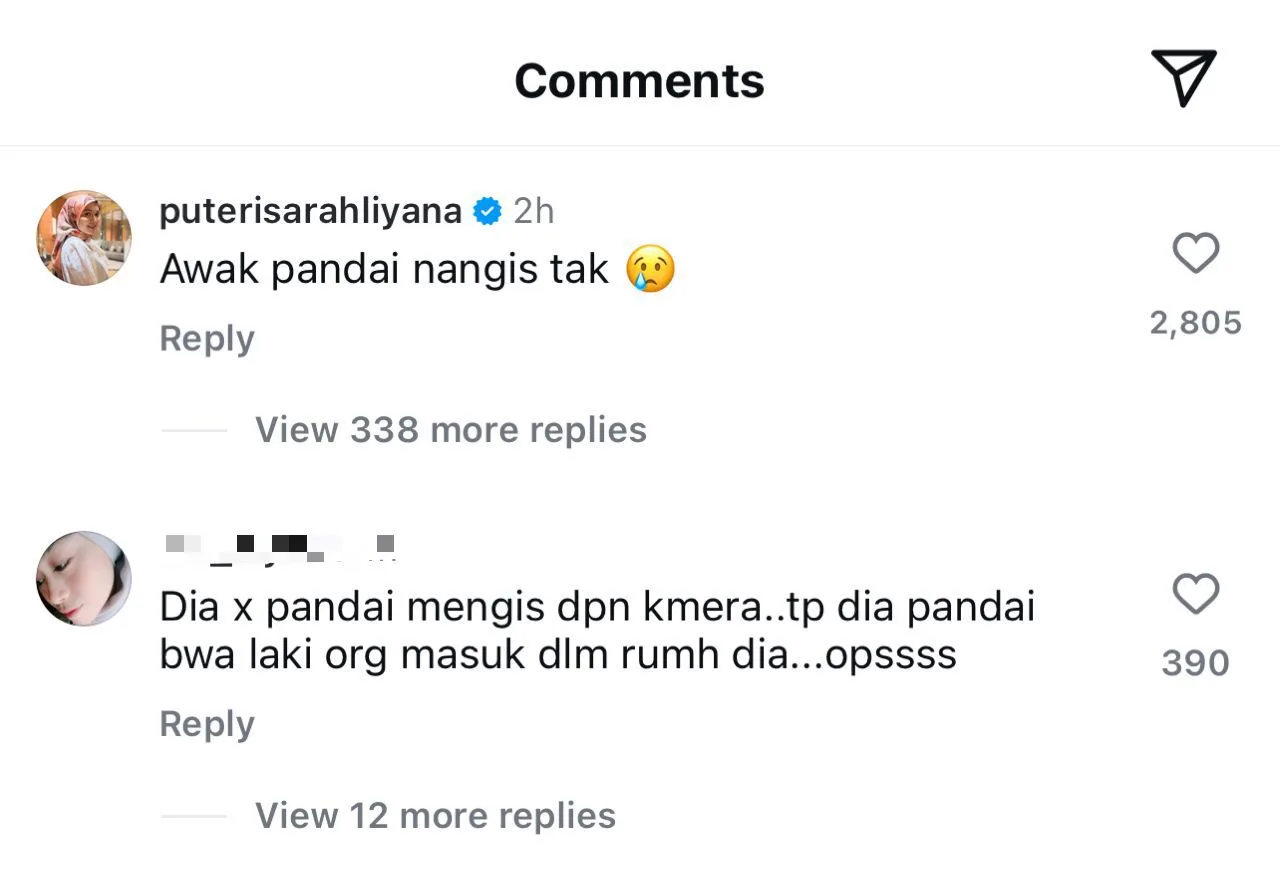Puteri Sarah atau nama sebenarnya, Puteri Sarah Liyana Megat Kamaruddin, dengan bersahaja menulis komen, “awak pandai nangis tak” di ruangan komen Instagram Bella. Komen ini mendapat hampir 3,000 tanda suka (likes) dan mencuit hati para pengguna media sosial.