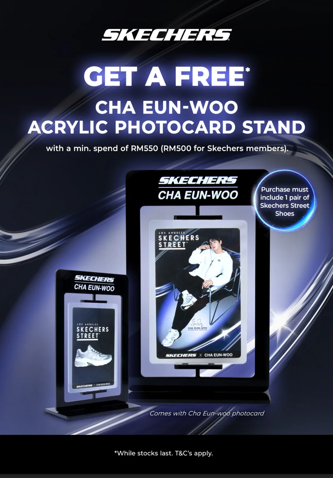 Sebagai sebahagian daripada pelancaran, Skechers menawarkan hadiah eksklusif dengan pembelian pelanggan yang membelanjakan RM550 dan ke atas (RM500 untuk ahli Skechers) akan menerima acrylic photocard stand Cha Eun Woo secara percuma, termasuklah photocard.