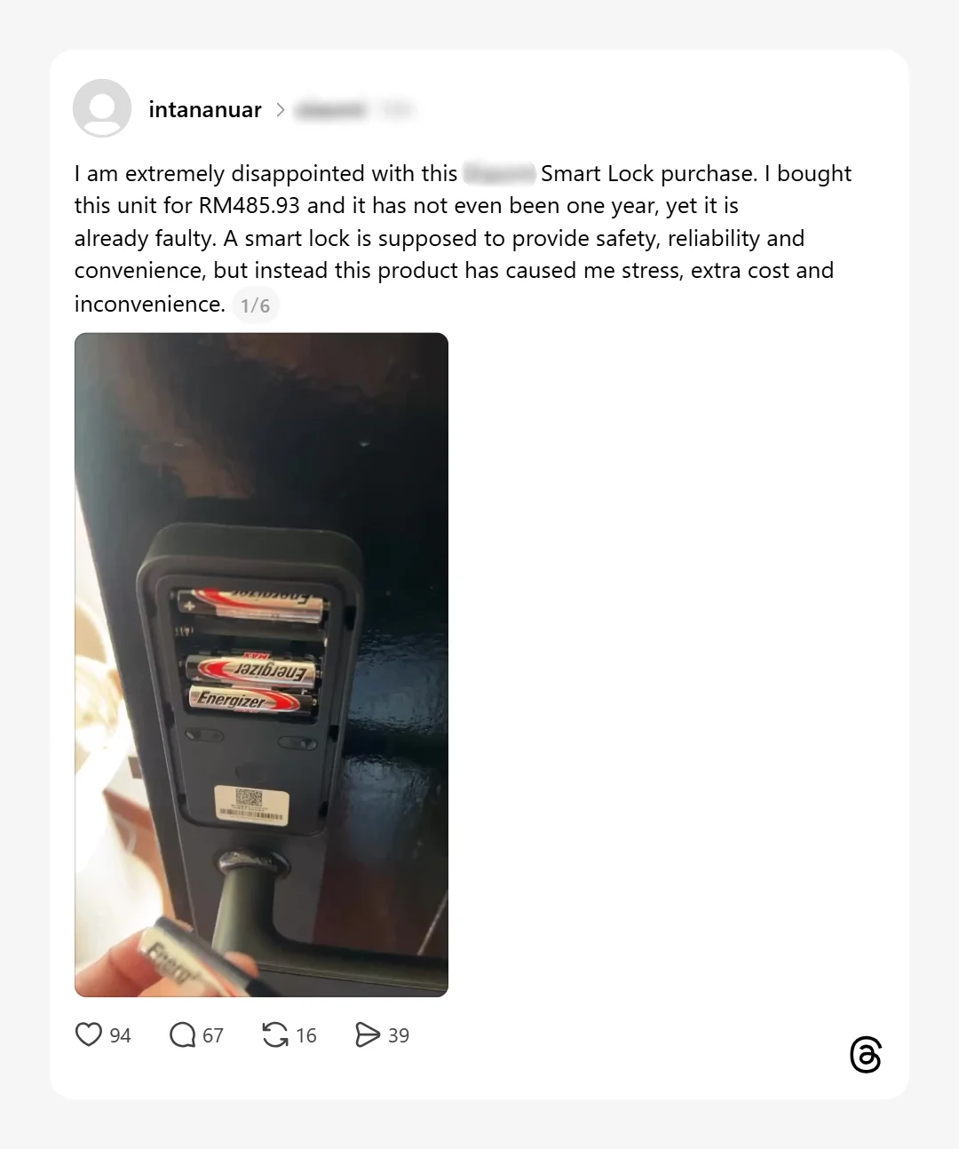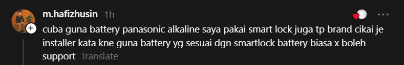 Menurut perkongsian di Thread, peranti kunci pintar itu tiba-tiba tidak berfungsi langsung, tiada lampu,dan tiada respons meskipun menggunakan bateri alkaline baharu seperti yang disarankan pihak penjual.
