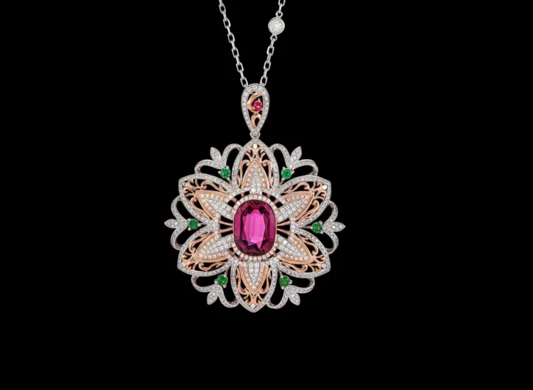 Antara yang mencuri perhatian MURAI ialah set yang menampilkan kilauan berlian bersama emas kuning, diinspirasikan daripada bentuk songket yang tersusun rapi. Diperbuat daripada emas putih dan emas kuning 18K, rekaan berlapis dan bertingkat memberi efek dimensi yang membuatkan pantulan cahaya nampak begitu elegan. Ia bold, eksklusif dan dalam masa sama kekal malar segar – memang pilihan tepat untuk mereka yang mahu buat statement di pagi Syawal.