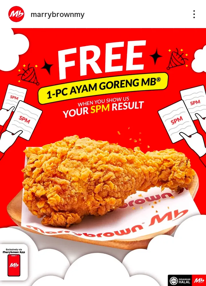 Tebus 1 ketul Ayam Goreng MB percuma melalui aplikasi Marrybrown dengan paparan keputusan SPM.