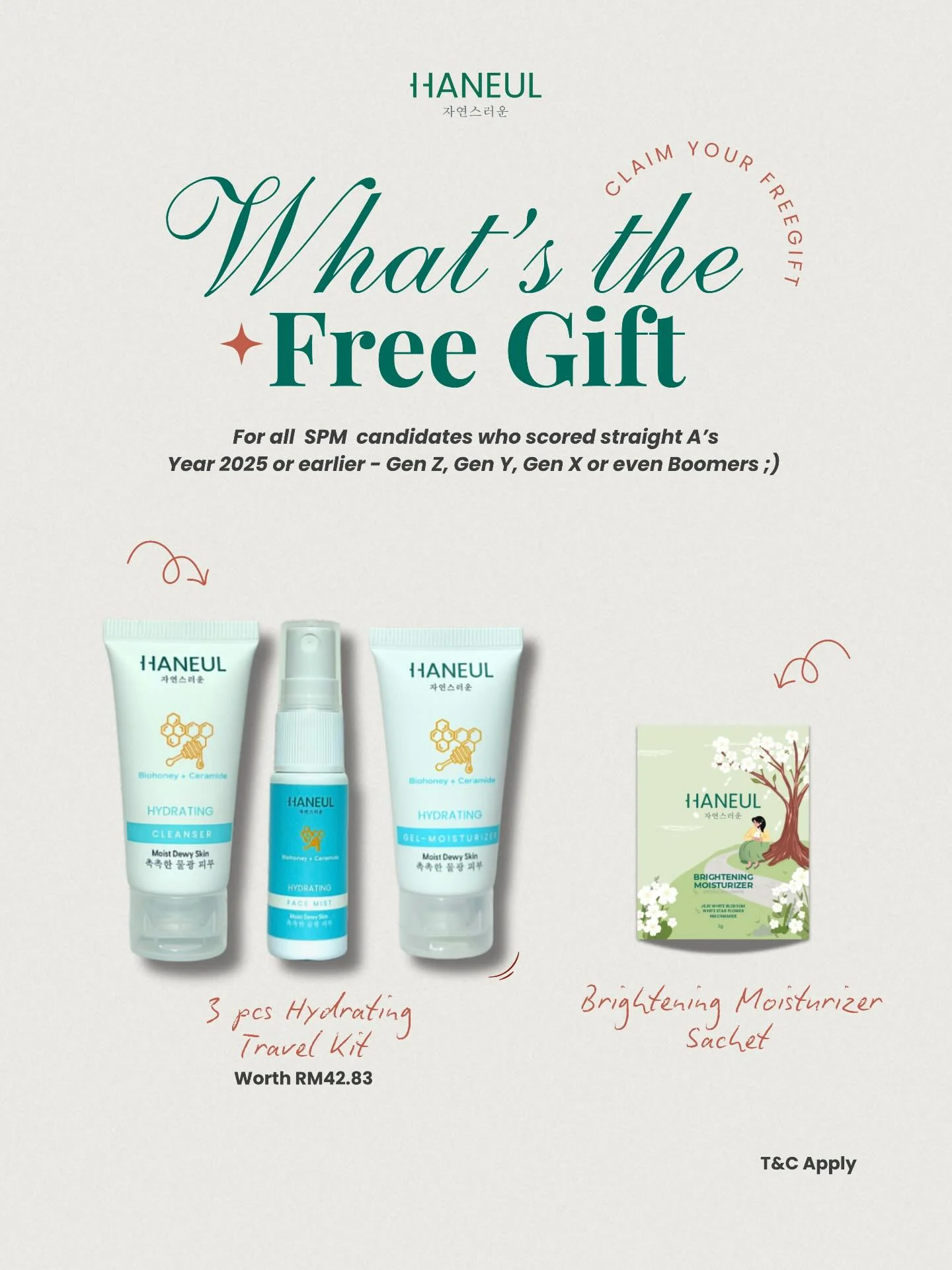 Khas untuk pelajar Straight A, boleh tebus: 3 keping Hydrating Travel Kit bernilai RM42.83 dan Brightening Moisturizer bundle