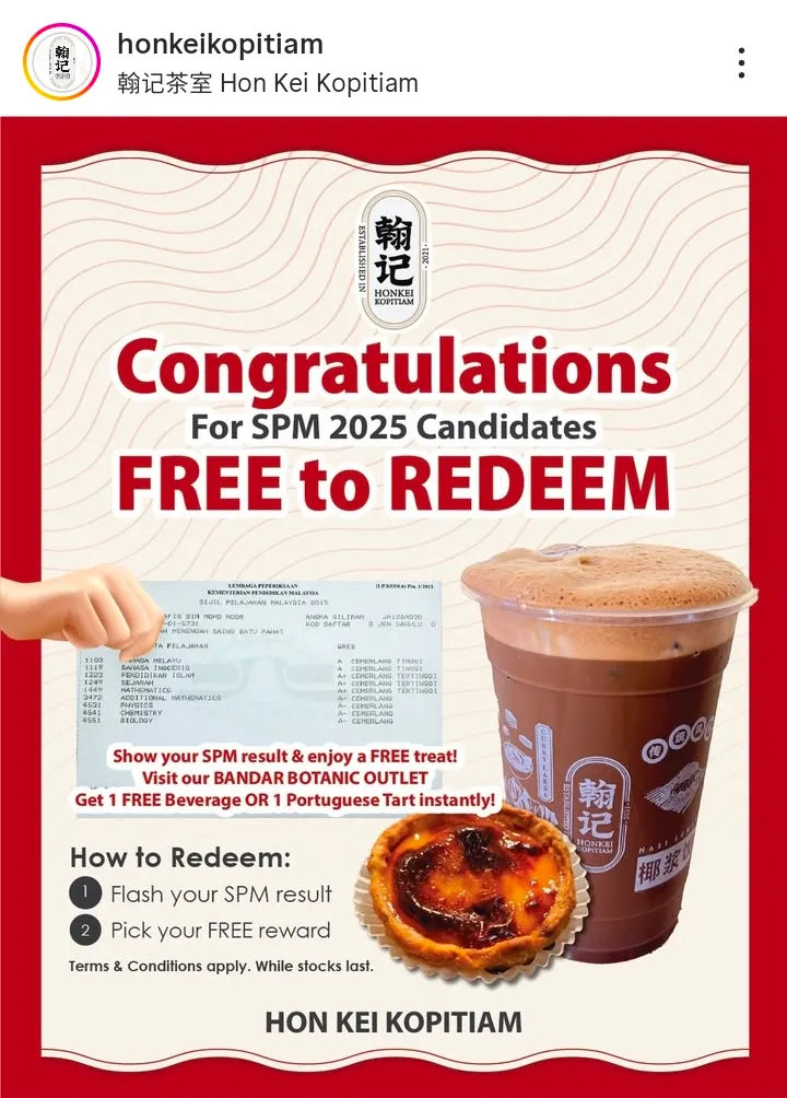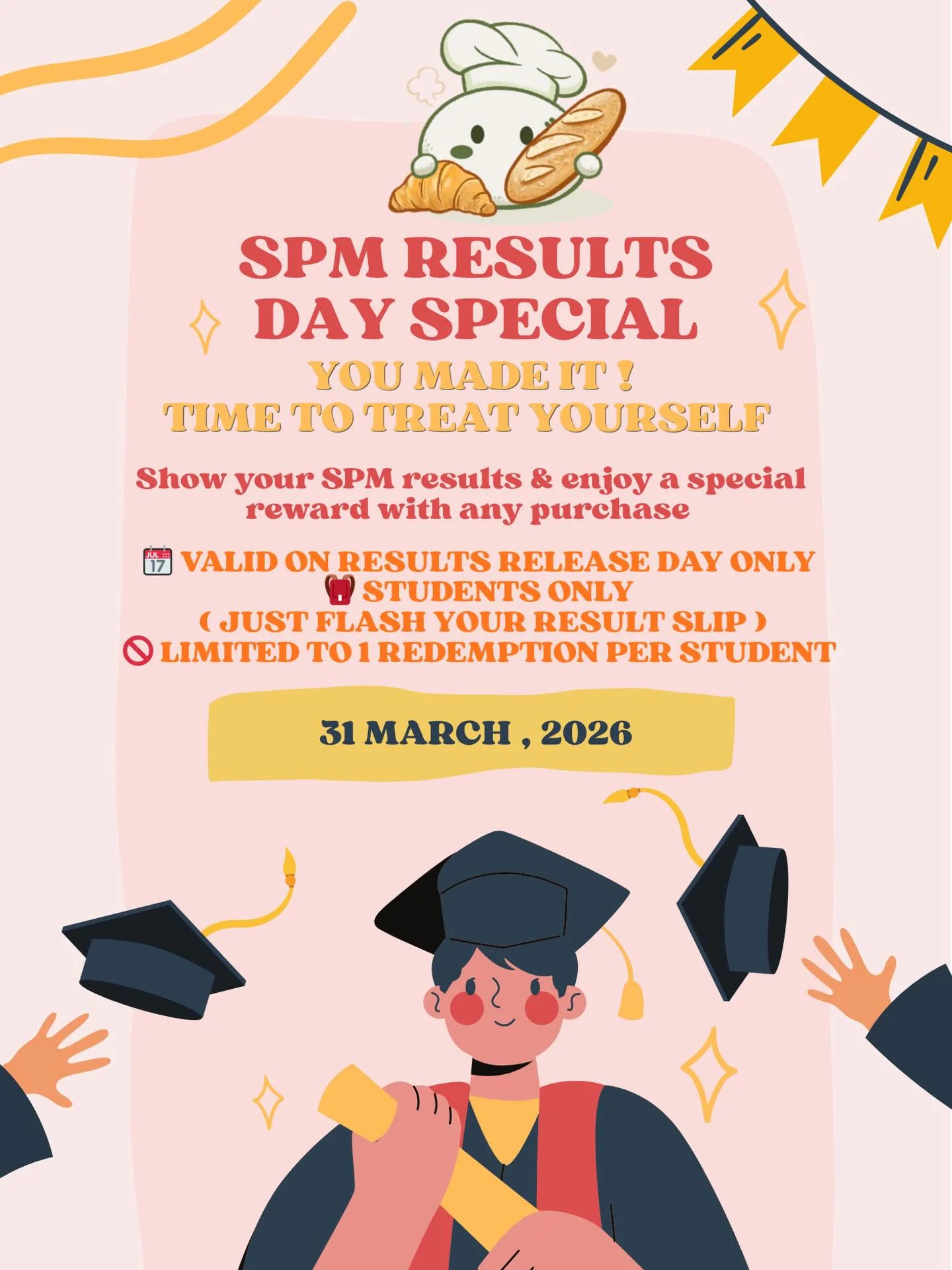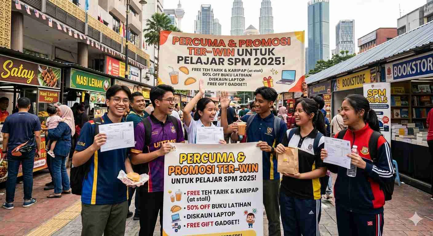 Tawaran Buy 1 Get 1 Free untuk pelajar yang menunjukkan keputusan SPM 2025. Ada juga promosi minuman percuma khas untuk pelajar Straight A, namun perlu post gambar dan tag di media sosial. Tawaran ini turut terbuka kepada guru dengan ID staf.