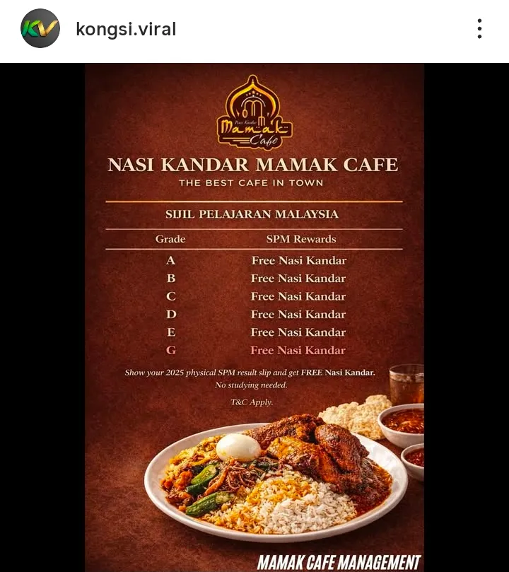 Ini paling legend ,semua pelajar layak dapat Nasi Kandar percuma tanpa mengira gred (A hingga G). Memang vibe “no judgement zone”.