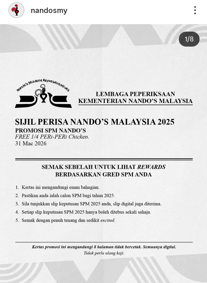 Pelajar boleh menebus 1/4 PERi-PERi Chicken secara percuma hanya dengan menunjukkan slip keputusan SPM 2025 (fizikal atau digital) di kaunter.