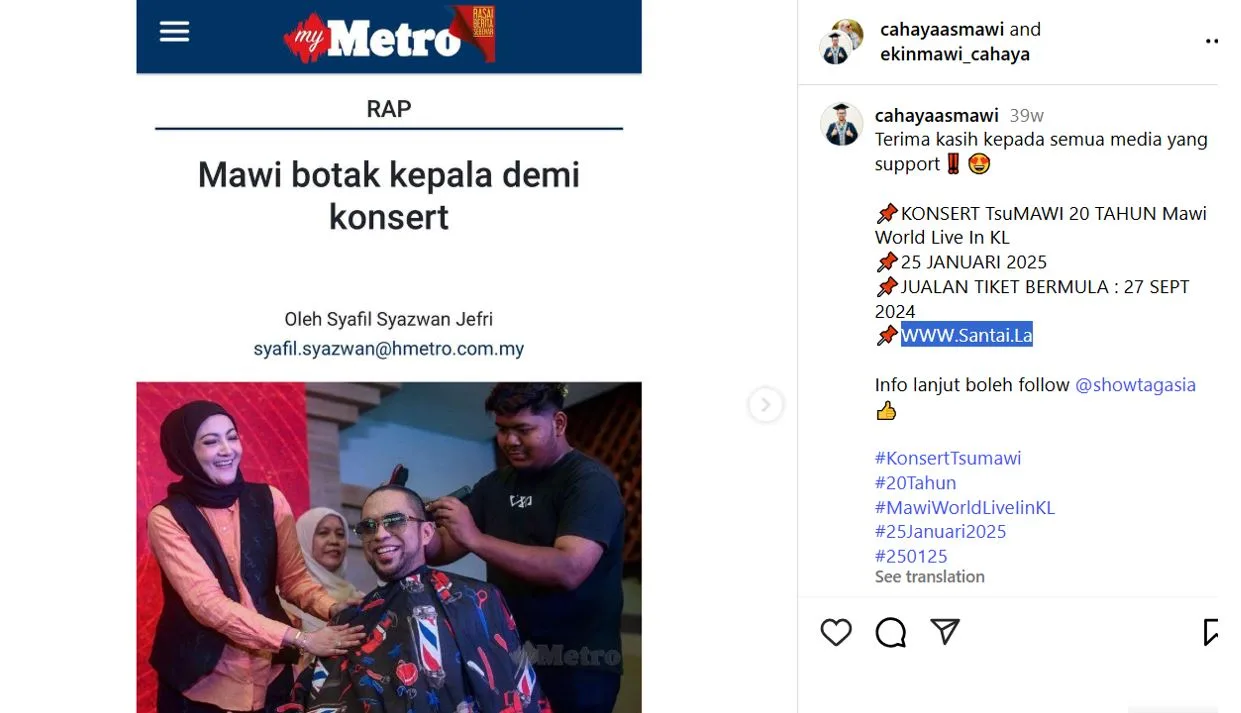 Sebelum ini penyanyi dan penyampai radio, Mawi, ada mengumumkan akan menganjurkan konsert solonya iaitu “Konsert Tsumawi 20 Tahun Mawi World Live In Kuala Lumpur” yang akan diadakan di Mega Star Arena Kuala Lumpur, pada 25 Januari 2025.