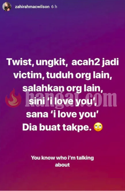 “Twist, ungkit, acah-acah jadi victim, tuduh orang lain, salahkan orang lain, sini ‘I Love You’, sana ‘I Love You’, You know who I’m talking about (Twist, ungkit, acah-acah jadi mangsa, tuduh orang lain, sini I love you, sana I love you. Dia buat takpe. Kamu tahu siapa yang saya maksudkan,” tulisnya Di IG Stories.