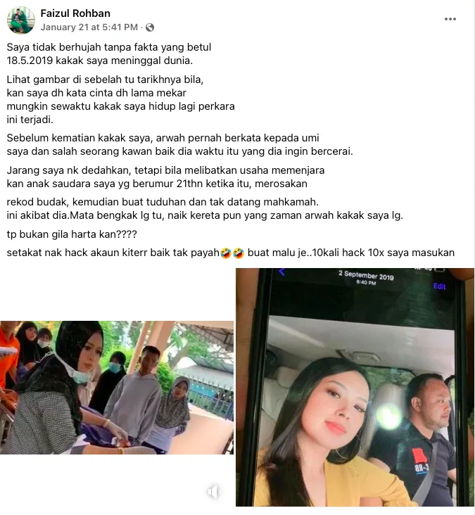 Menerusi hantaran yang dilakukan di laman Facebok,  Faizul memberitahu bahawa dia tidak akan mendedahkan tanpa fakta yang betul dan tampil mendedahkan foto abang iparnya bersama seorang wanita yang diambil pada  September, beberapa bulan selepas arwah terlibat dalam kemalangan pada 18 Mei 2019.