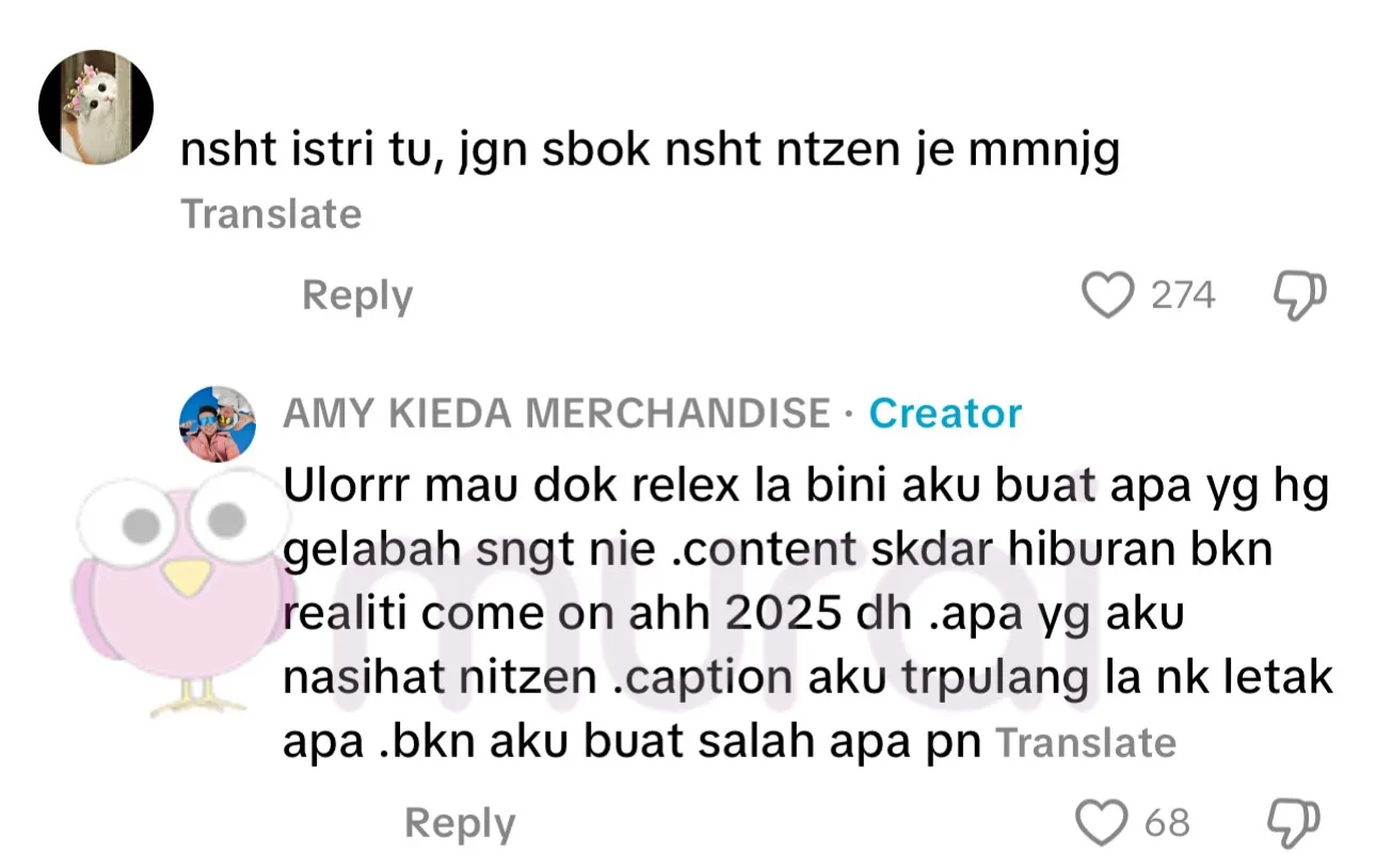 “Mau dok relax la bini aku buat apa, yang hang gelabah sangat ni. Konten sekadar hiburan bukan realiti, come on la 2025 dah. Apa yang aku nasihat netizen. Kapsyen aku terpulang la nak letak apa. Bukan aku buat salah apa pun.”-balas suami Kieda Crepe