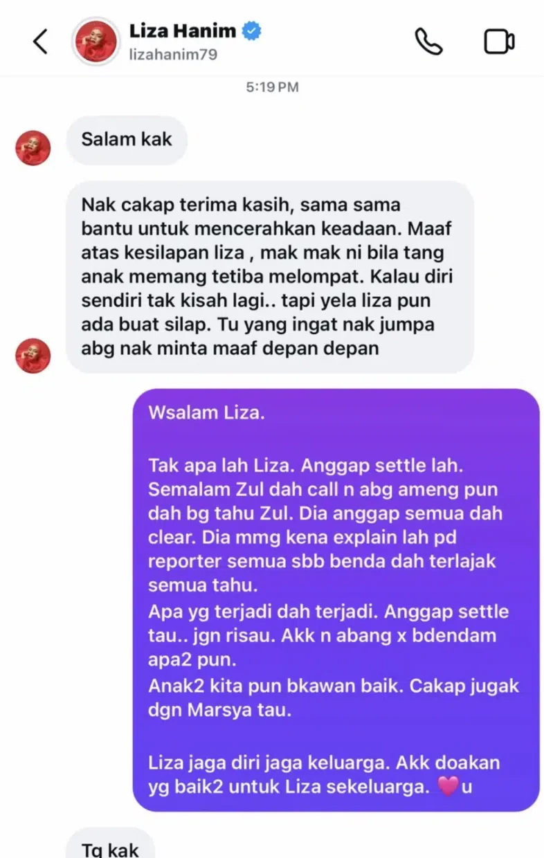 Apa yang buat ramai netizen lega, Liza juga menyuarakan harapan untuk bertemu secara berdepan dengan Ameng bagi memohon maaf secara lebih ikhlas. Bukan itu sahaja, dia turut menghantar mesej kepada Sabariah, berterima kasih kerana membantu meredakan keadaan. Nampak di situ, semua pihak main peranan untuk cool down situasi.